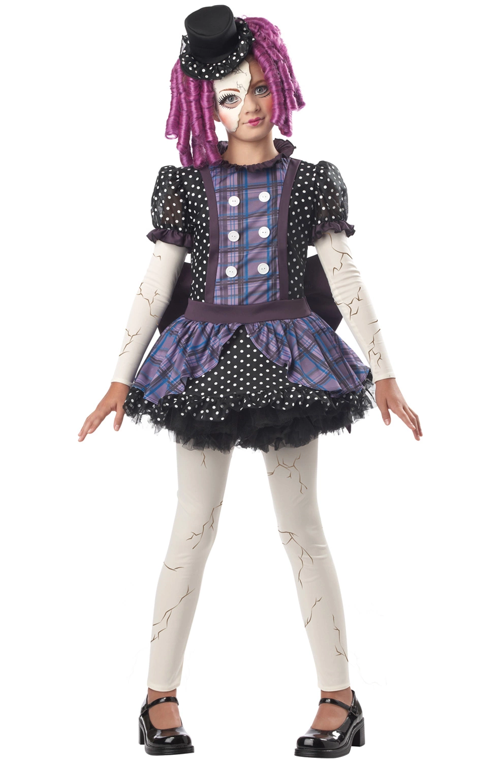This Halloween, your little girl can look like she stepped out of a haunted doll house with this creepy, yet cool costume! This costume features leggings and sleeves that look just like a cracked porcelain doll! Top it off with a broken half mask that will gurantee your costume looks like no one else’s!
