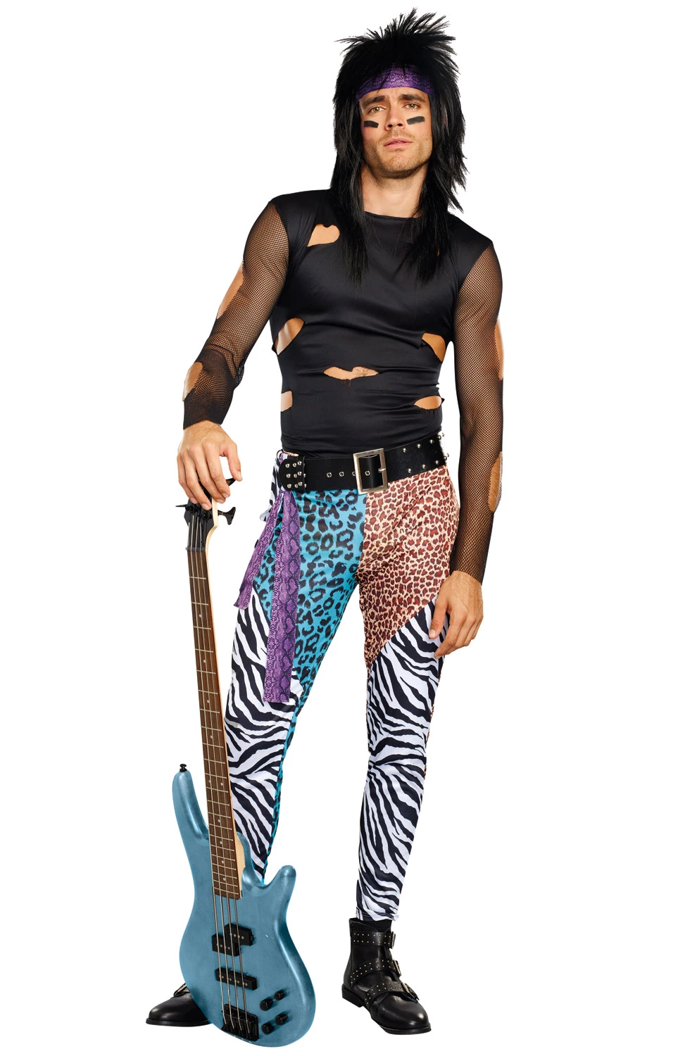 Get ready to rock out in this heavy metal inspired costume. This Hair Band Dude Costume for men features a ripped black shirt with fishnet sleeves and multi-colored and multi-patterned animal-print pants. Now you’re ready to take the stage in this grunge look.