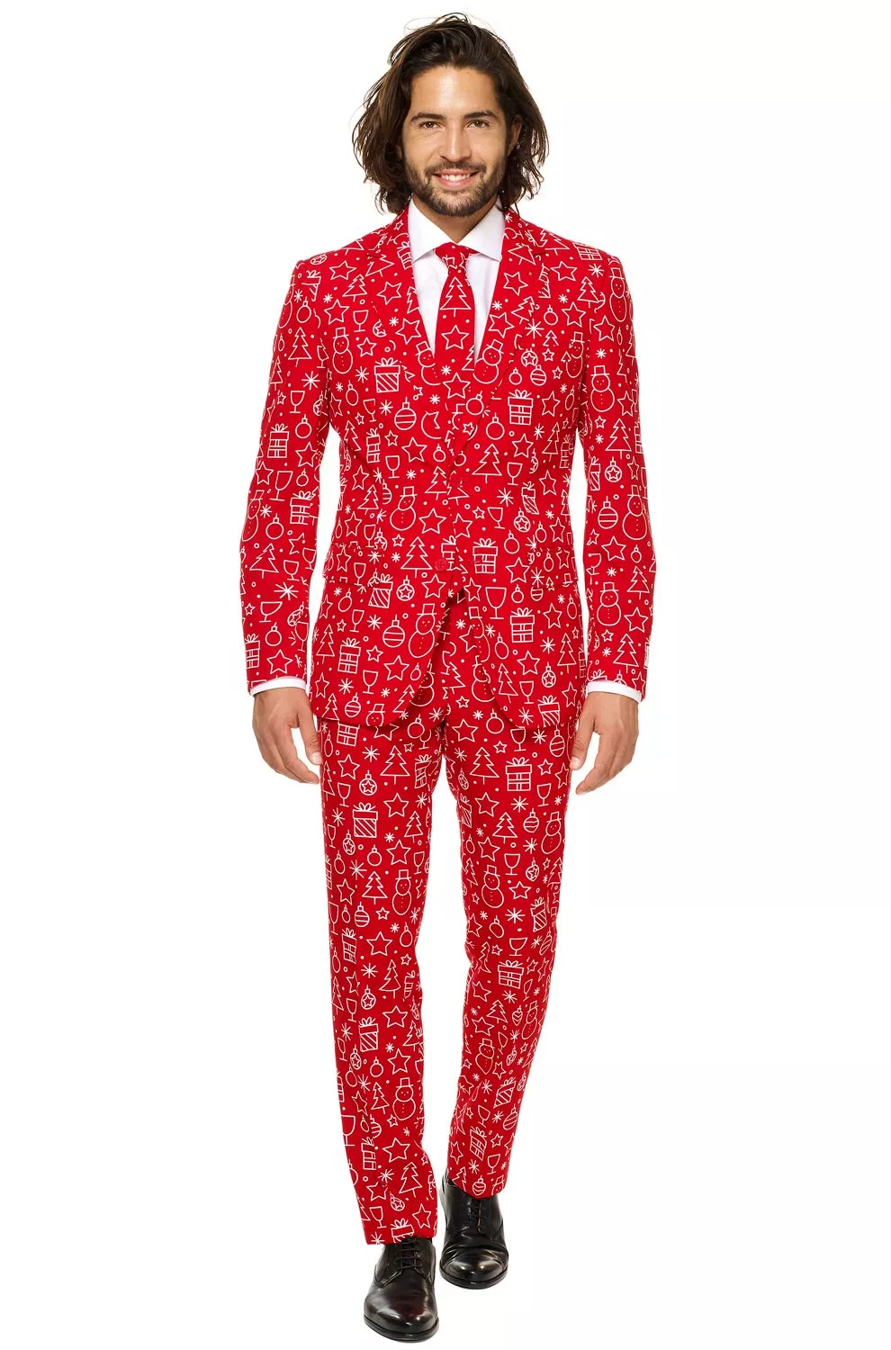 Seasons greetings! Celebrate the holidays in this fun Iconicool Suit Adult Costume. This suave red suit features Christmas ornaments, Christmas trees, wrapped presents, and other holiday-themed icons to help you celebrate Christmas in style!