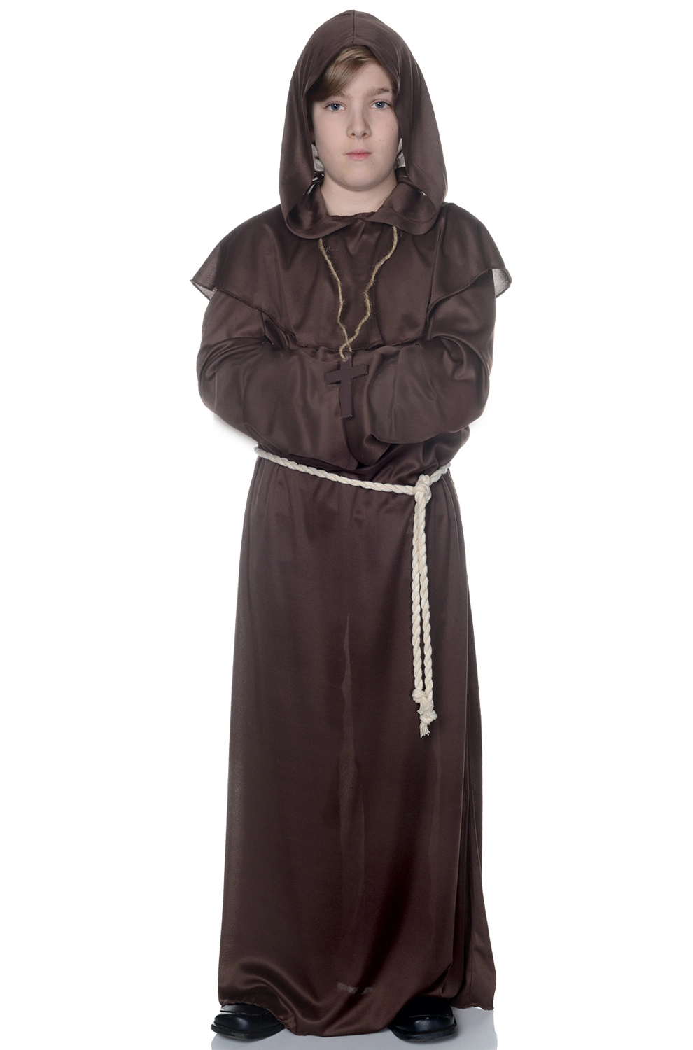 Perfect for school plays or religious presentations, this brown Monk Robe features an attached hood and a rope belt.