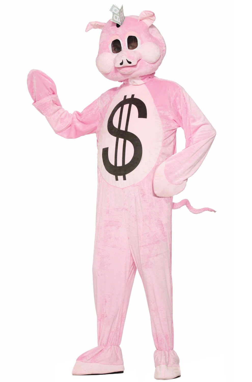 Make your childhood piggy bank come to life with this unique costume. This fun costume features a pig headpiece with a fake coin slot on top with fake money stocking out of it, and mesh eye opening so that you can see through, a jumpsuit with attached mitts and a huge dollar sign in front, and pink shoe covers.