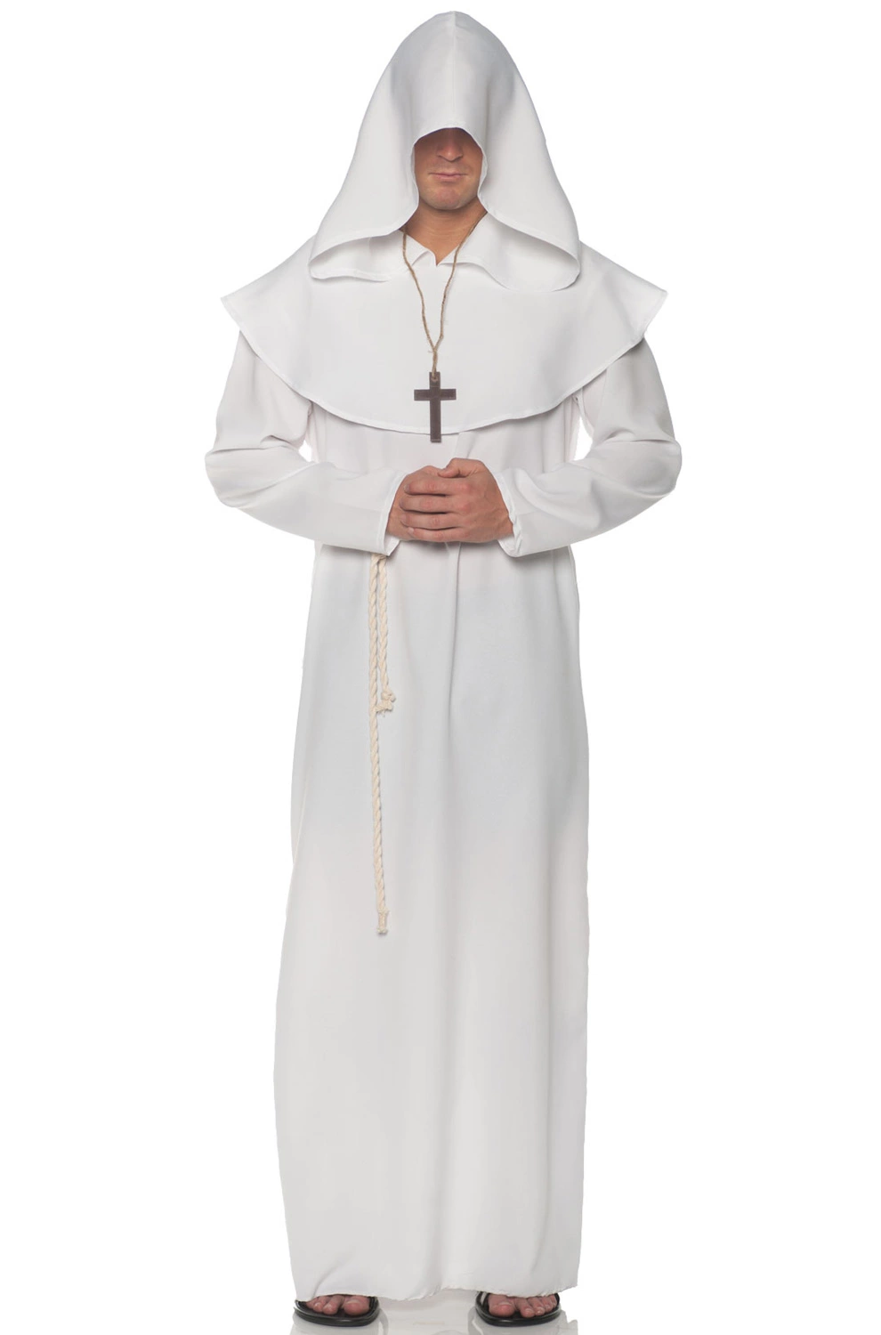 Perfect for religious presentations or projects, this white Religious Monk costume features a robe, rope belt, and collar with attached hood.