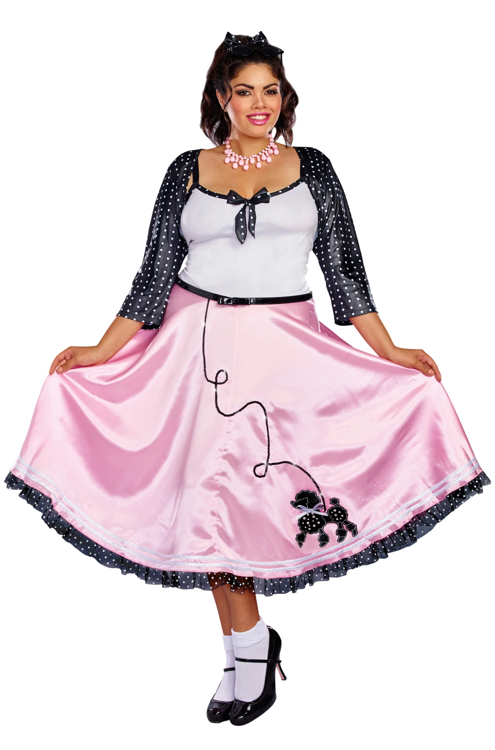 Shooby do down to the local diner in this Rock Around The Clock costume. Full of 50s flair, this sexy rendition of the classic poodle skirt includes a poodle skirted dress with halter style top. Also includes a polka dot printed shrug, matching hair bow, belt and sunglasses.